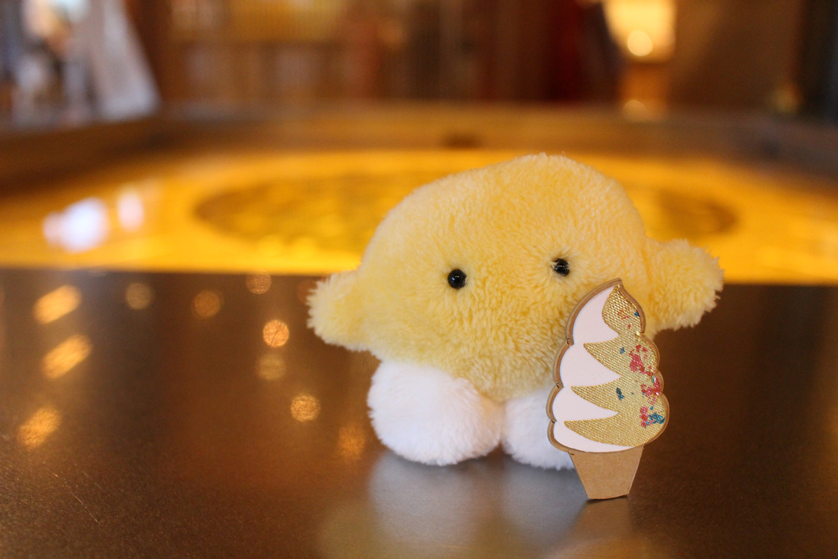「ぬい撮り旅行」の定番といえば、ご当地スイーツとの記念撮影。今井金箔では、金沢名物として大人気の金箔ソフトを推しと一緒に楽しむことができます。